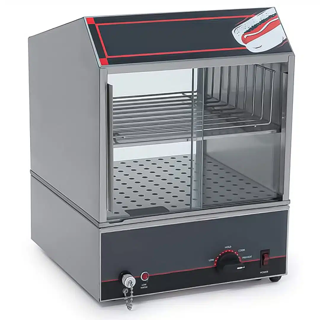 Appareil à Hot Dog à vapeur en inox  permet une cuisson rapide des pains il suffit de quelques minutes pour cuire à la vapeur dans le réservoir transparent les saucisses et réchauffer.