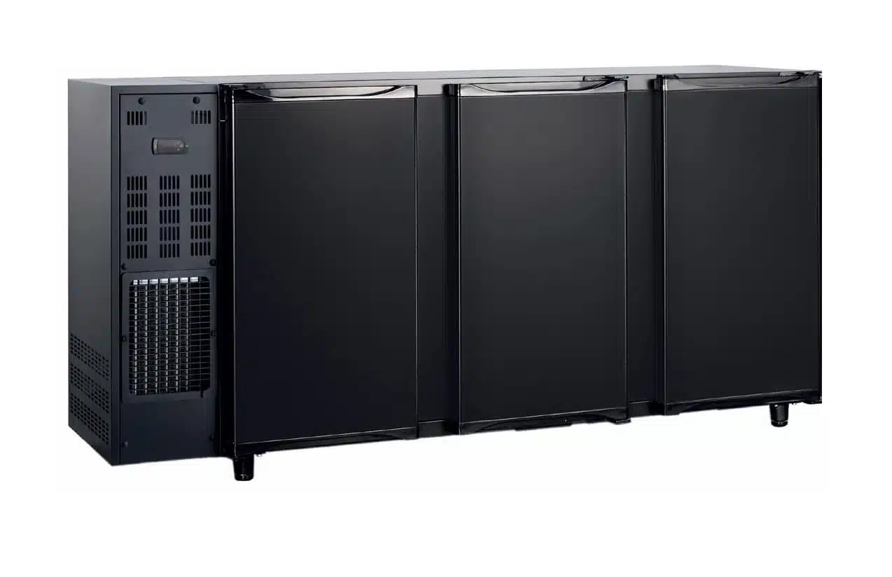 Arrière-bar à 3 portes pleines avec un groupe logé de 390 L, idéal pour le stockage et l’exposition de boissons destiné aux restaurateurs.