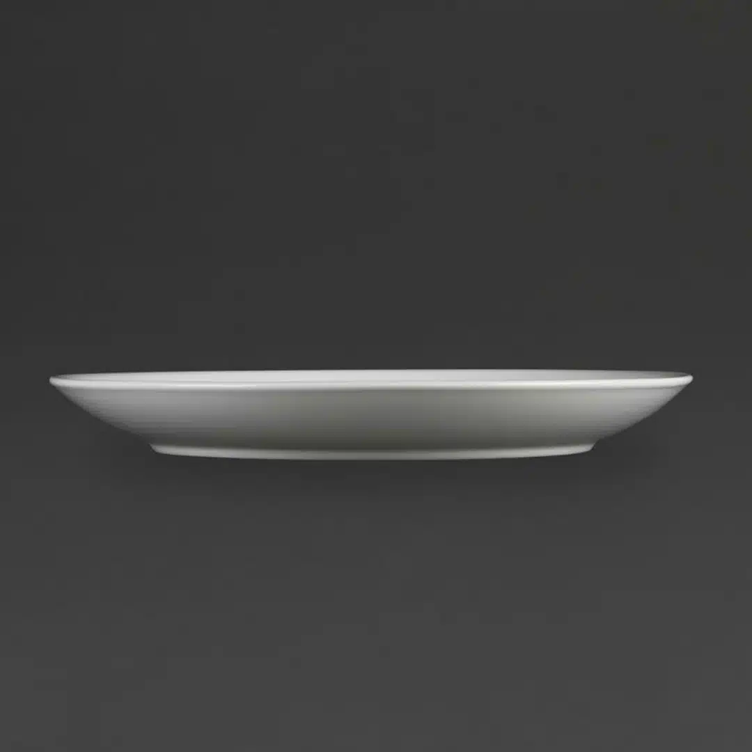 Assiette porcelaine plate ronde, empilable, idéale pour sublimer vos présentations tout en répondant aux besoins quotidiens des professionnels.