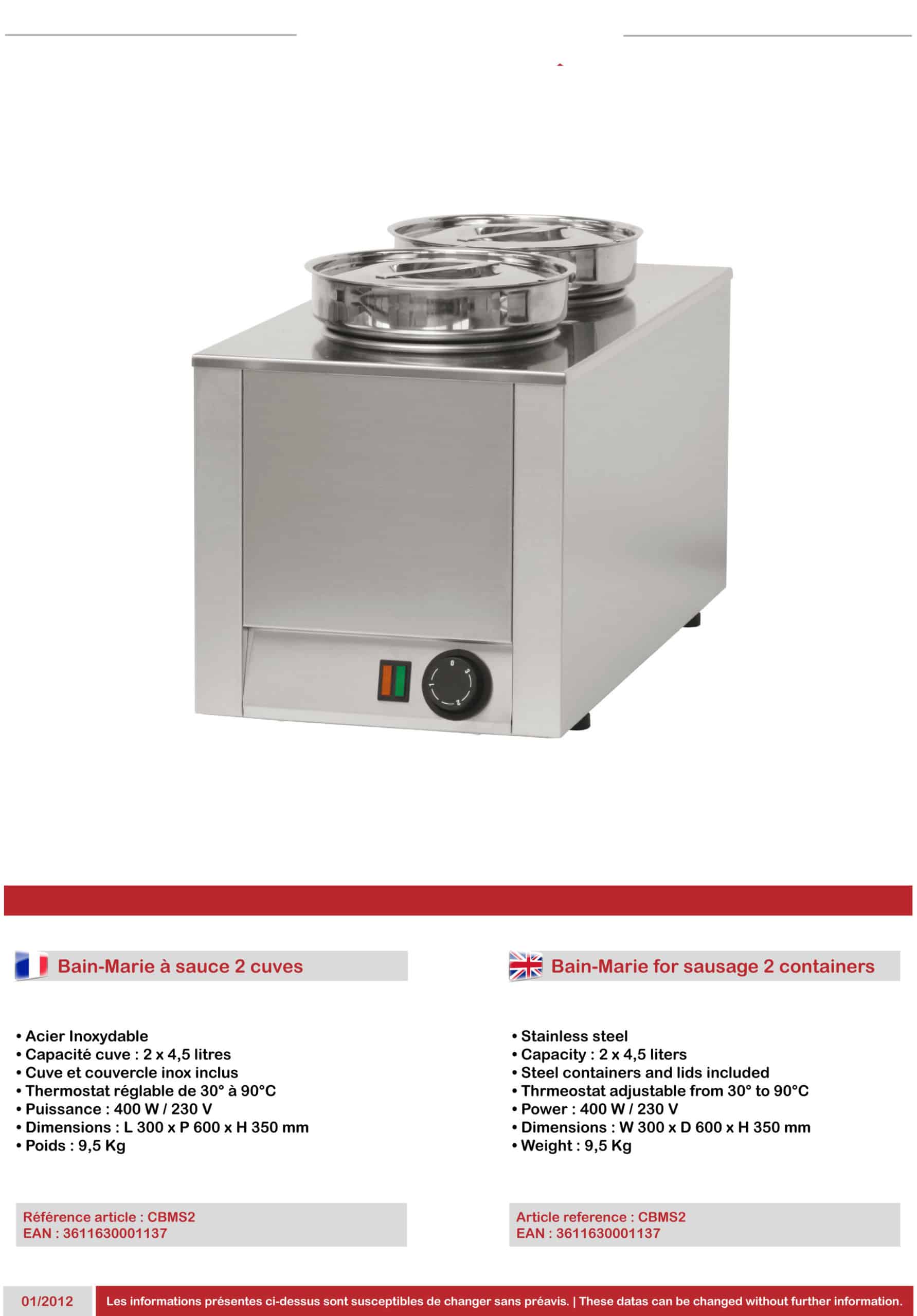 Bain marie à sauce 2 cuves professionnel en acier inoxydable 400 W