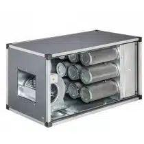 Caisson en acier galvanisé avec trappe d’accès aux filtres et au groupe moto-ventilateur.