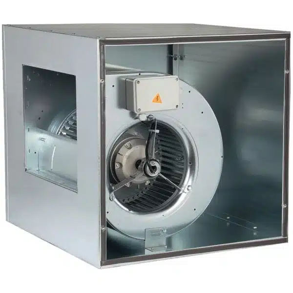 Caisson en acier galvanisé avec trappe d’accès au groupe moto-ventilateur.