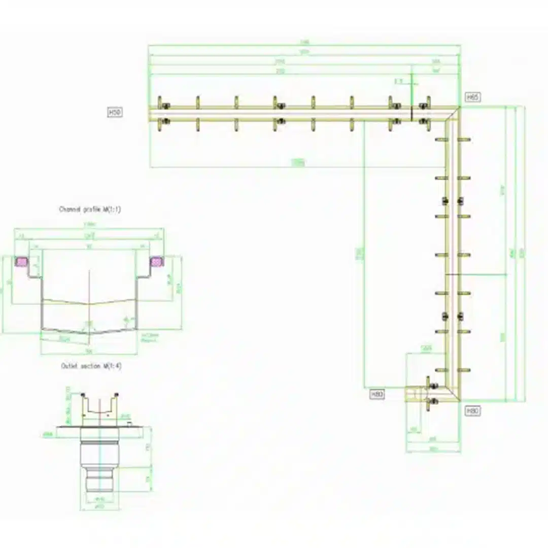 Caniveau en U MODUL 125 grille caillebotis inox AISI 304 sortie verticale centrée sur mesure