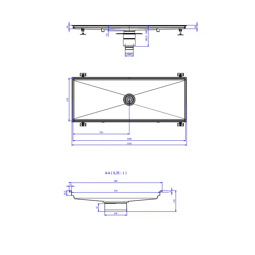 Caniveau en inox 1500 x 570 mm, en sortie verticale centrée DN110, un équipement parfait pour les professionnels dans la restauration.