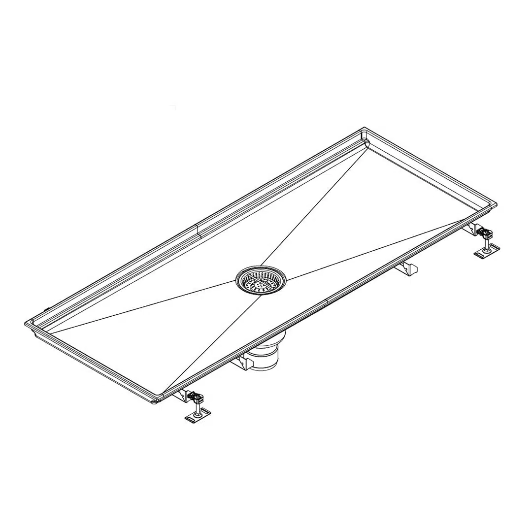 Caniveau en inox 1500 x 570 mm, sortie verticale centrée DN110, fabrication sur mesure