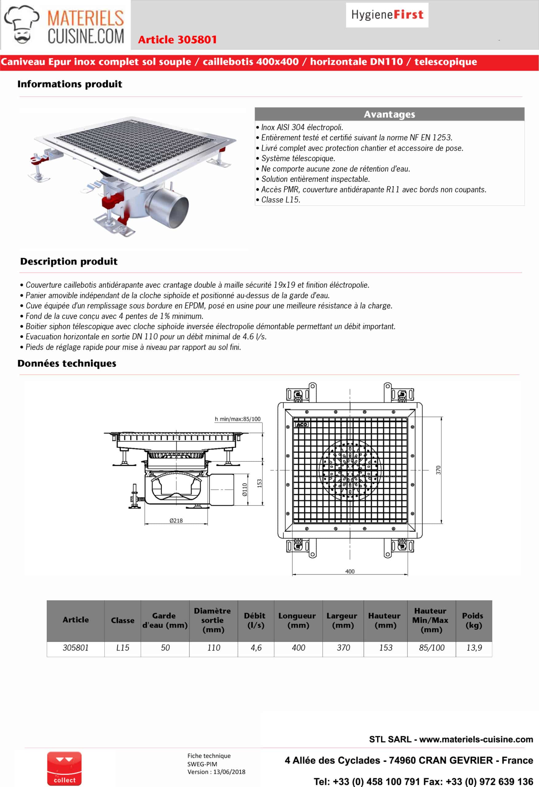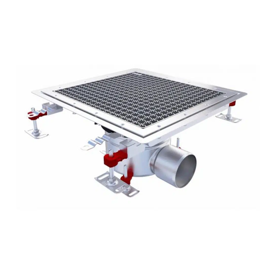 Caniveau Epur inox complet sol souple caillebotis 400×400 horizontale DN110 telescopique