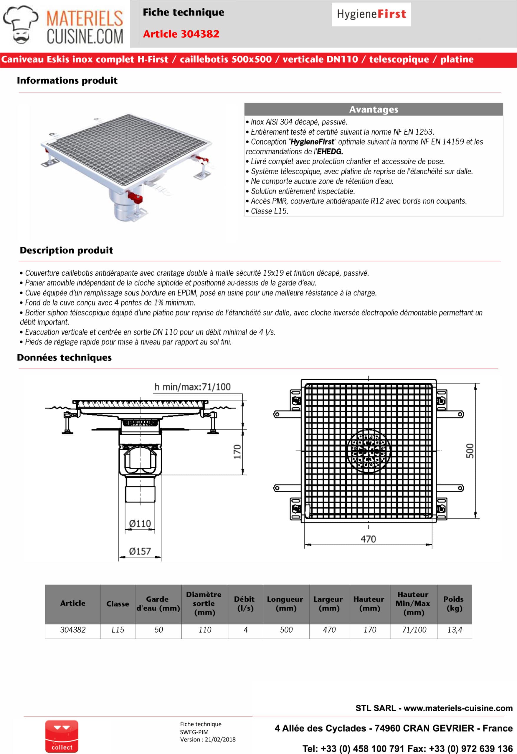 - Accessoires : Panier amovible indépendant de la cloche siphoïde, protection chantier, pieds de réglage rapide pour mise à niveau
