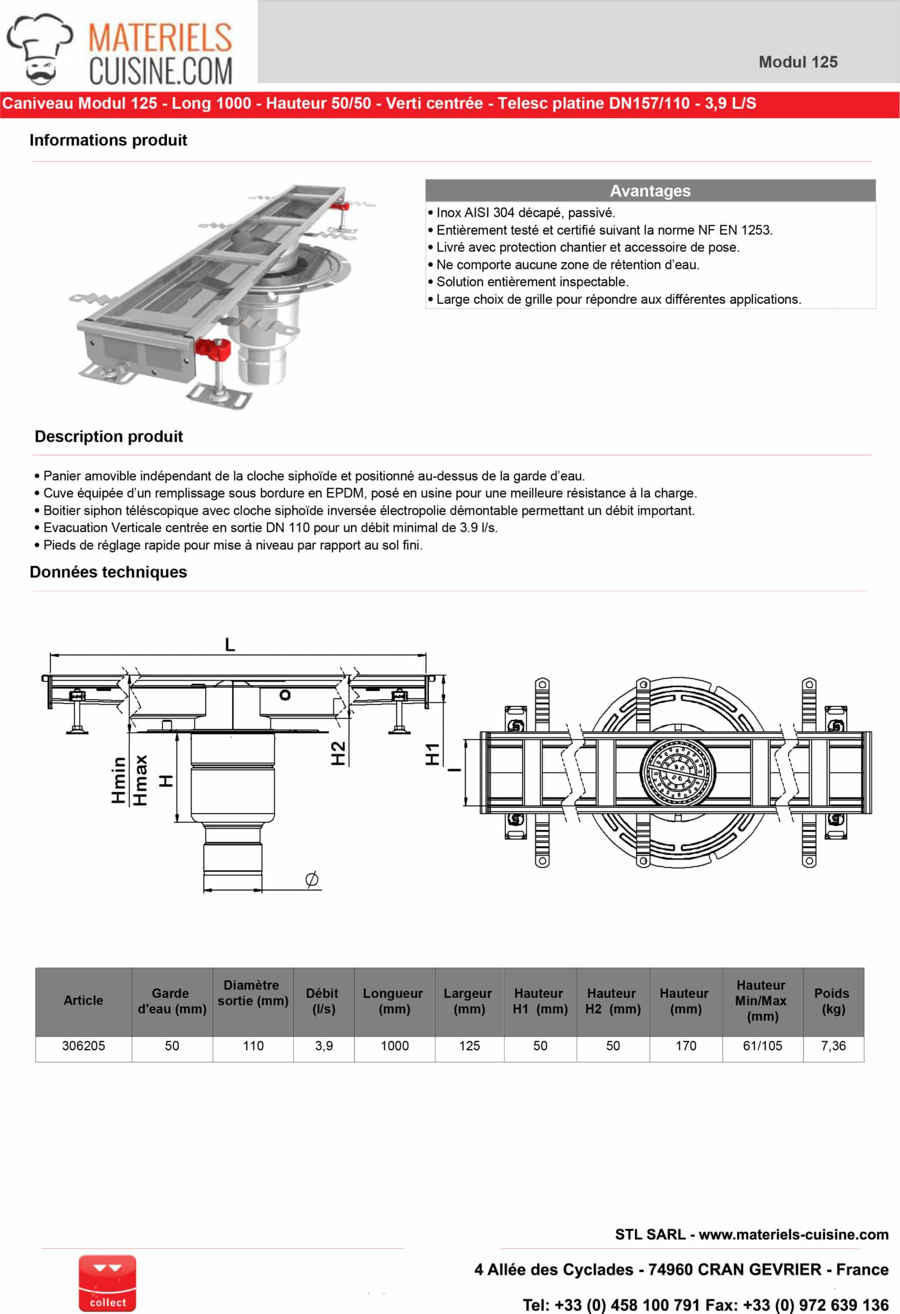 Caniveau sortie verticale Modul 125, disposant de large choix de grille pour répondre aux différentes applications, garantissant une meilleure hygiène, idéal pour les cuisines professionnelles.