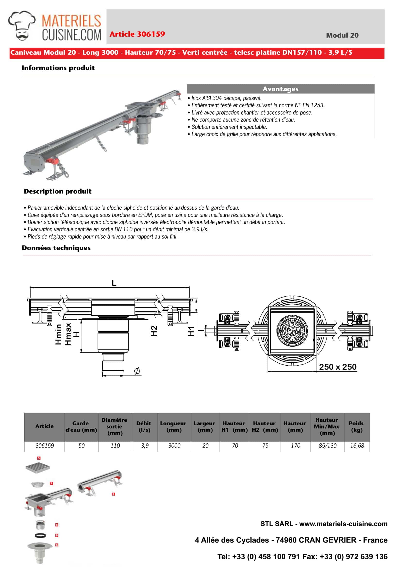 Découvrez le caniveau Modul 20, conçu pour les cuisines professionnelles, mesurant 3000 mm avec une sortie verticale centrée boîtier 157/DN110.