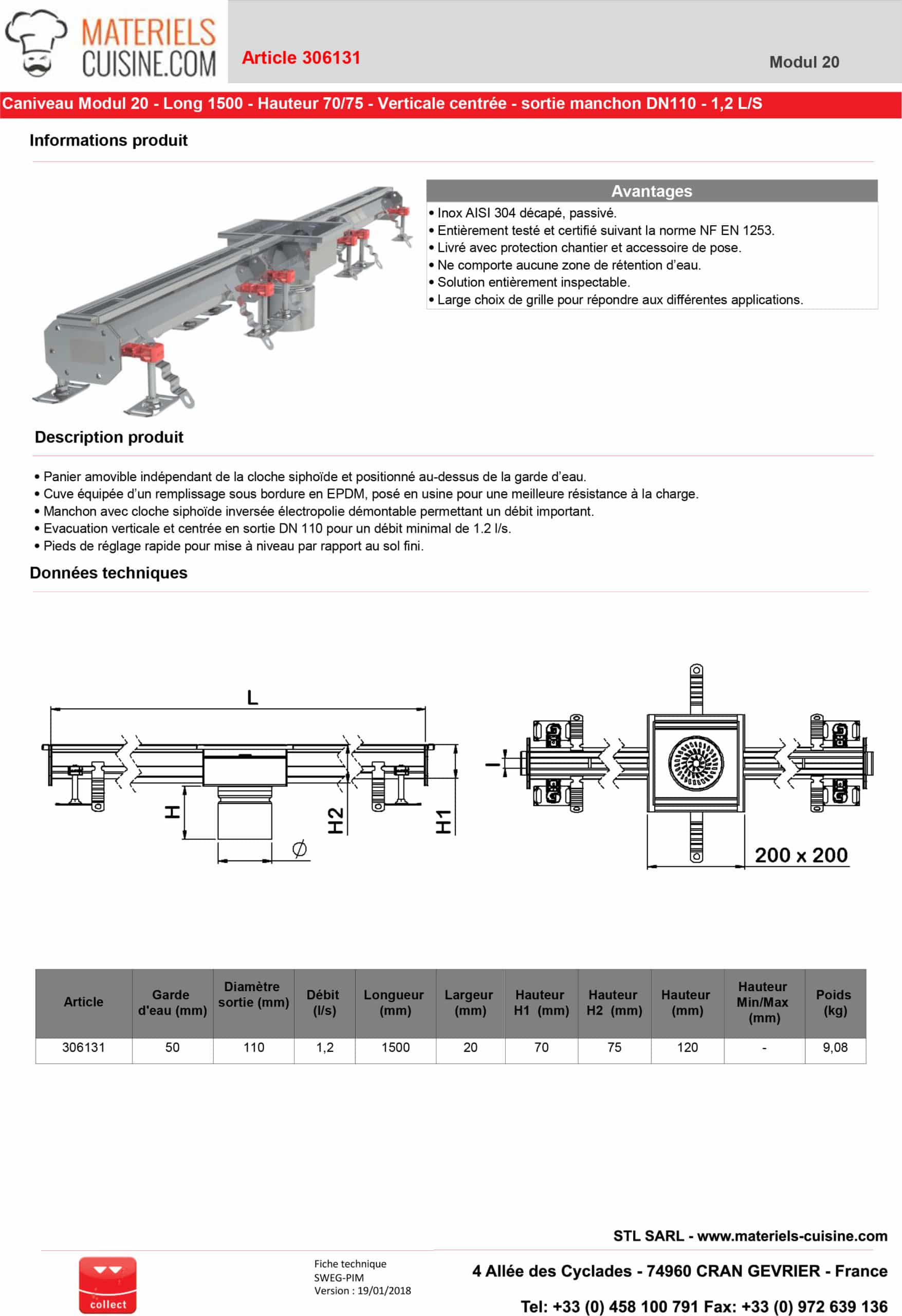 Caniveau sortie verticale Modul 20 L 1500 mm, avec sortie verticale centrée, simplifie l’entretien et garantit une gestion optimale des eaux usées, idéal pour les professionnels de la restauration.