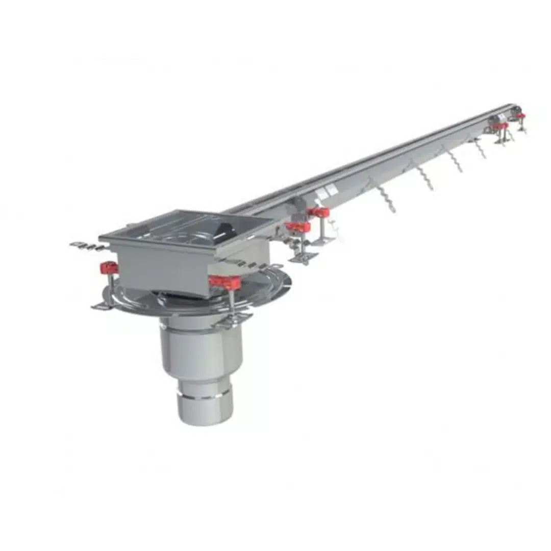Découvrez le caniveau en inox Modul 20, d’une longueur de 3000 mm, avec une sortie verticale.