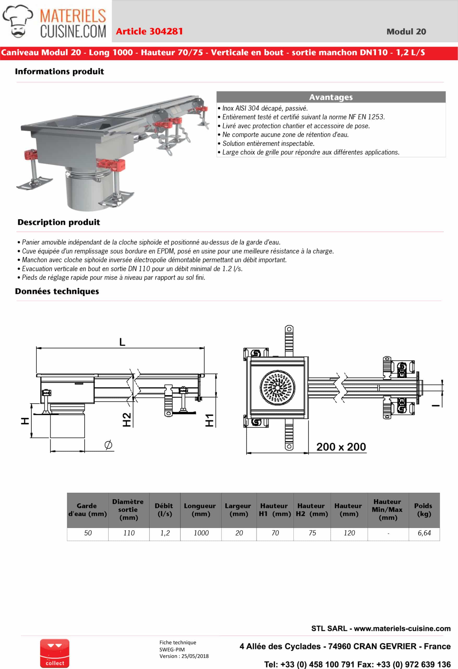 - Dimensions : 1000 mm de longueur, boîtier siphon 200 x 200 mm