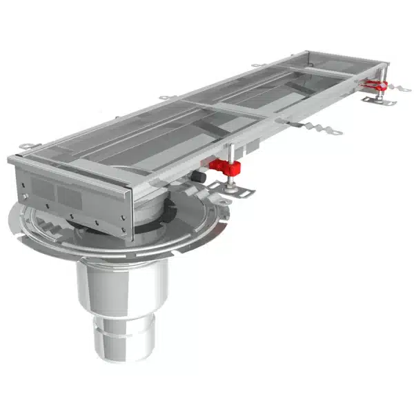 Découvrez le caniveau de sol Modul 200, mesurant 2000 mm et doté d’une sortie verticale en bout.