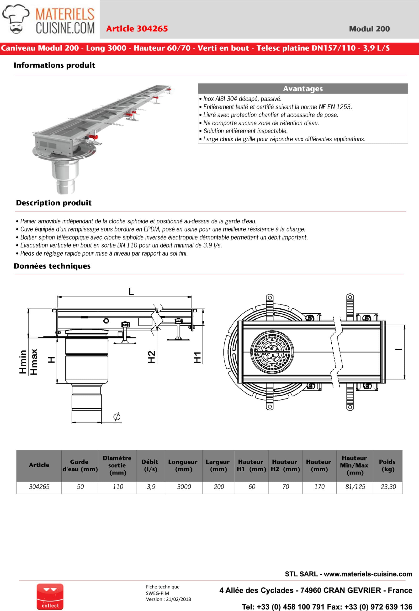 • Normes respectées : Entièrement testé et certifié suivant la norme NF EN 1253, garantissant sécurité et fiabilité.