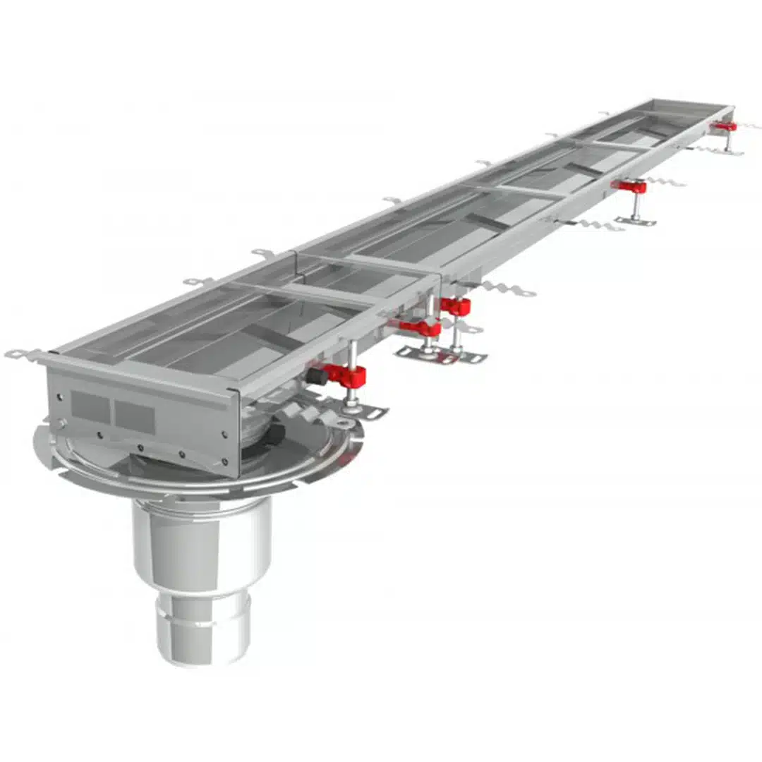Découvrez le caniveau de sol Modul 200, mesurant 3000 mm et doté d’une sortie verticale en bout.