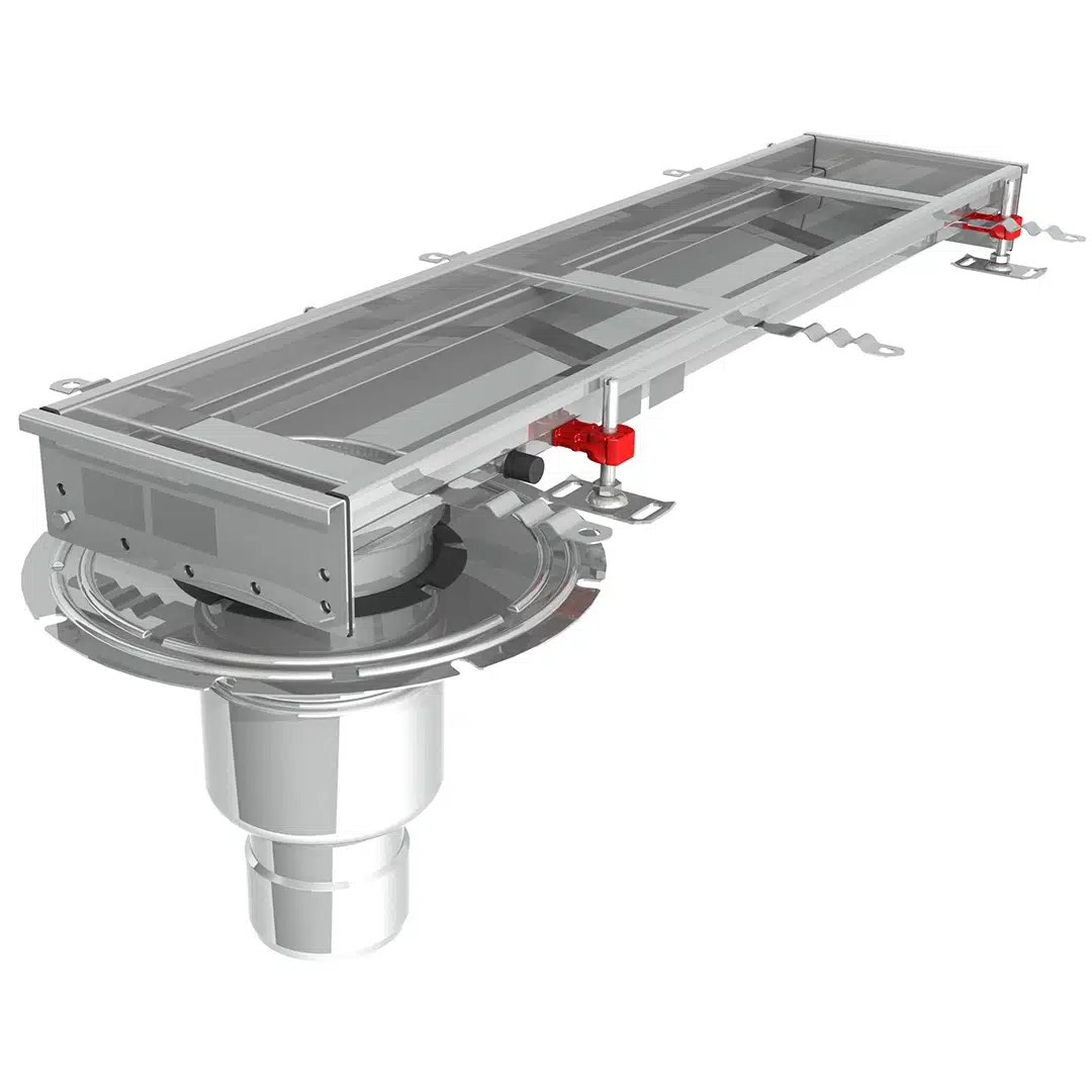 - Boîtier siphon télescopique avec cloche démontable : Ce caniveau dispose d’un boîtier siphon télescopique, équipé d’une cloche siphoïde inversée et électropolée. Ce système démontable permet un débit d’évacuation important, même en cas de flux intense.