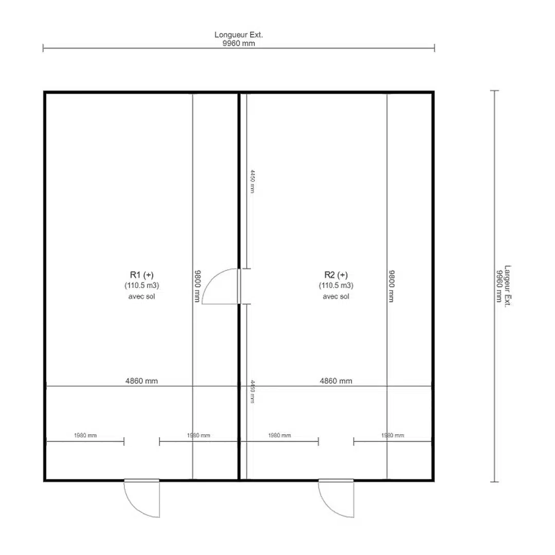 Dimensions extérieures : L 9960 x P 9960 x H 2480 mm