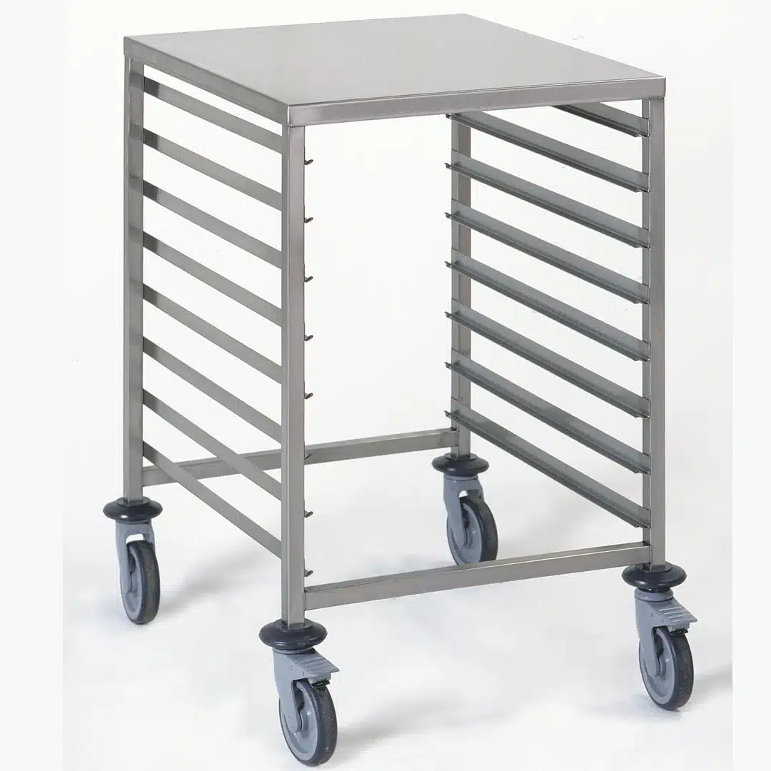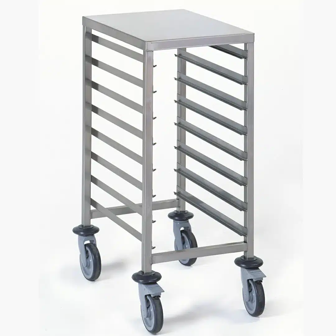 Chariot à glissière gastronorme, en acier inoxydable, pour le transport et la manutention des produits alimentaires.