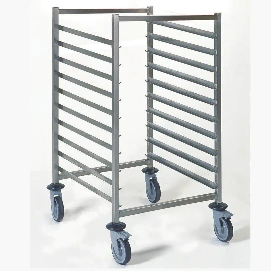 Chariot à glissière gastronorme, en acier inoxydable, pour le transport et la manutention des produits alimentaires.
