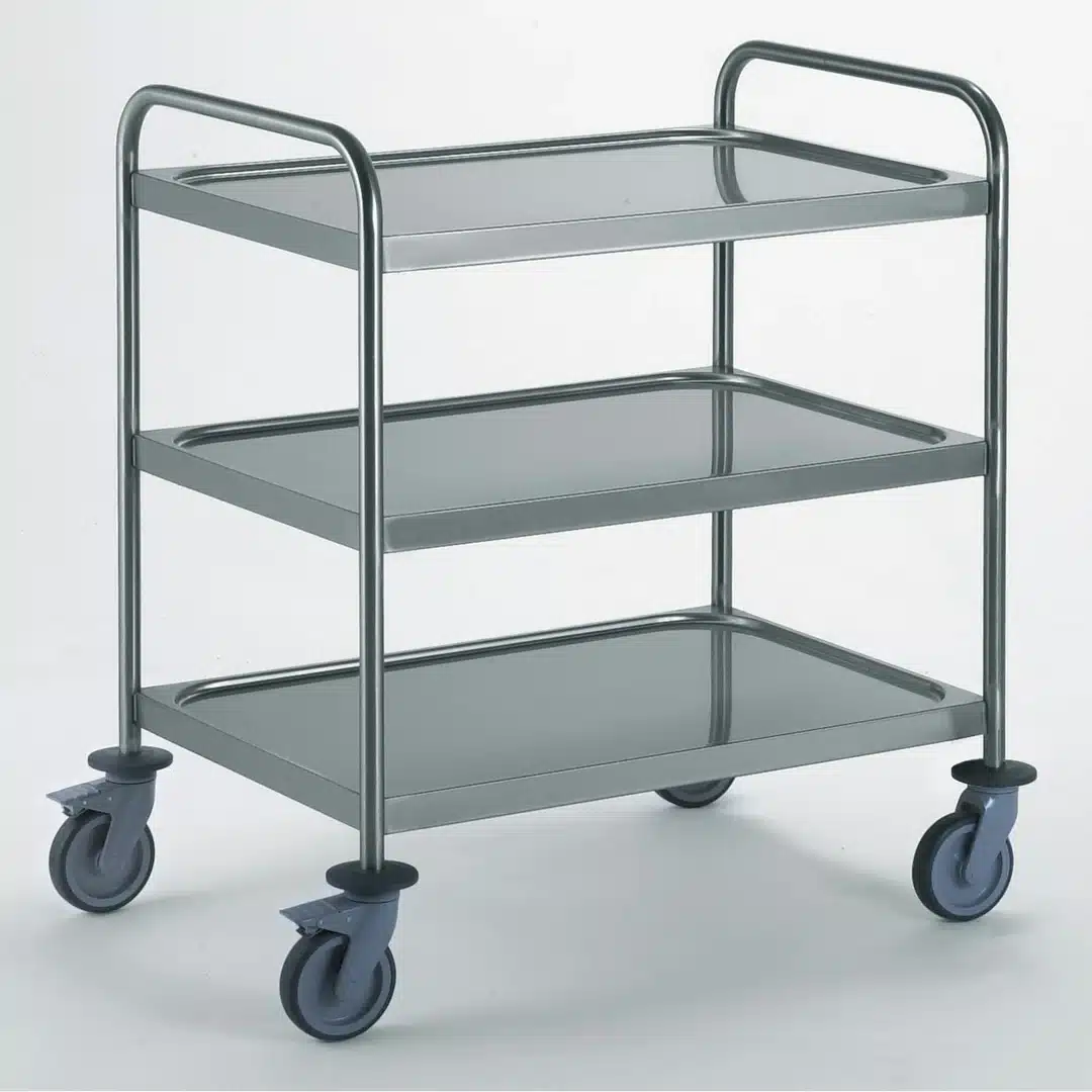 Desserte cuisine inox, pour le transport des produits alimentaires et divers ustensiles dans le domaine CHR, essentiellement gastronomique.