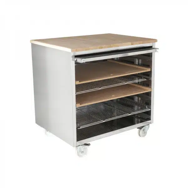 Notre chariot parisien ou armoire parisien est un meuble de structure en tube inox AISI 304, qui permet de faire reposer les pâtons sur planches ou sur grilles.
