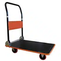 Chariot timon rabattable, robuste et compact, très pratique pour le rangement et le transport grâce à sa poignée repliable.