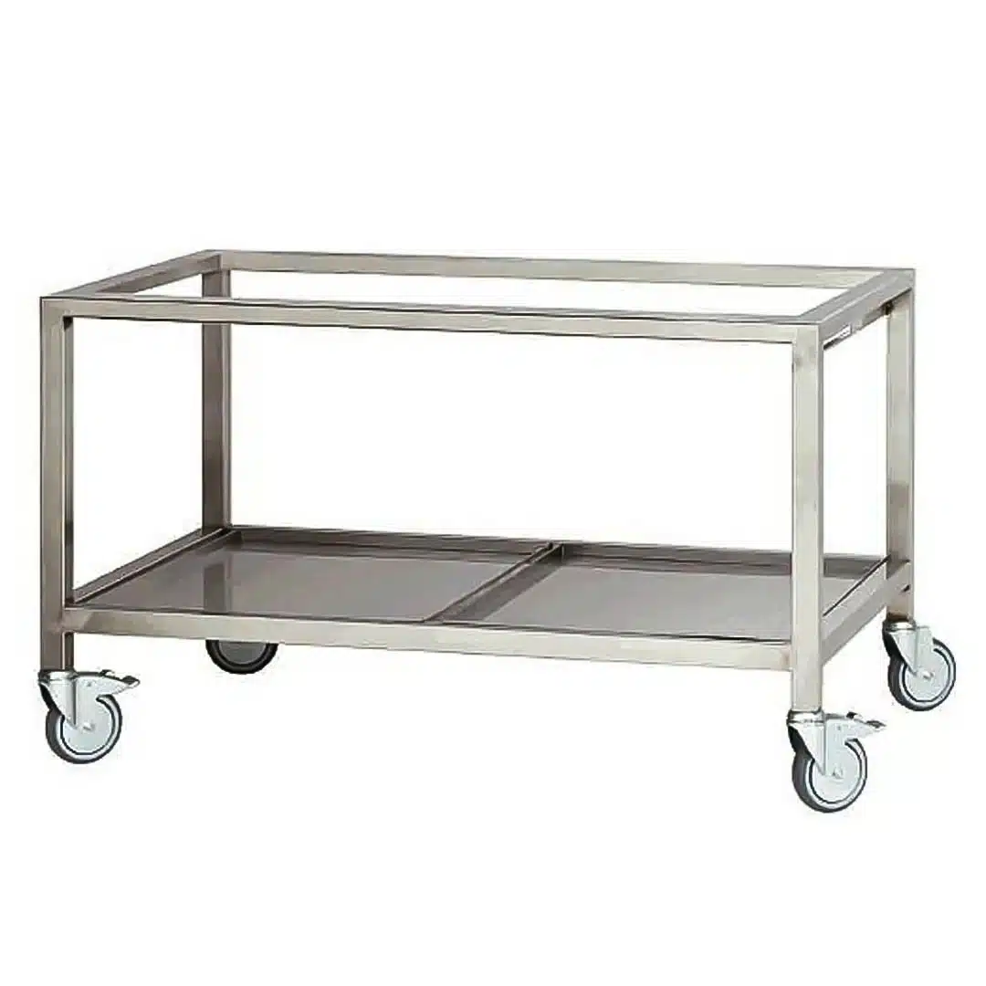 Châssis en inox avec étagère basse et roulettes, conçu pour faciliter le déplacement et le rangement de votre rôtissoire. Robuste et pratique, il offre un support stable tout en ajoutant une touche moderne à votre espace de cuisson.