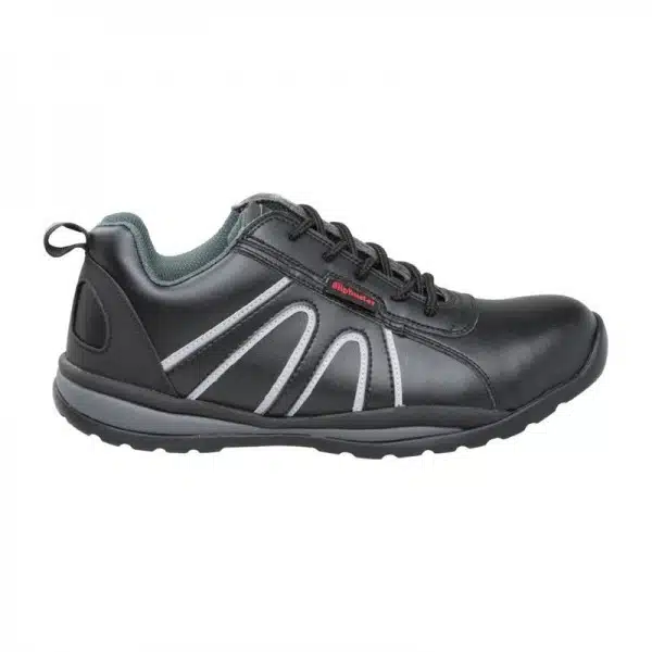 Basket de sécurité noir, semelle anti-glisse et anti-statique, semelle polyuréthanne double densité et dessus en cuir, résistant aux huiles et aux graisses.