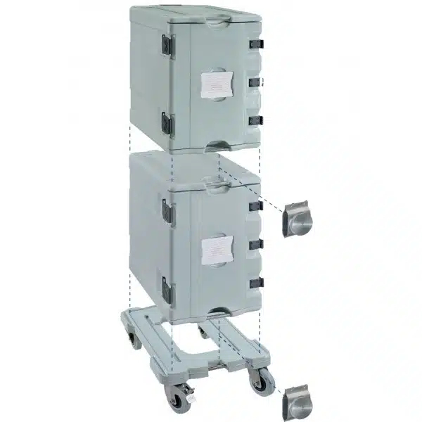 Système modulaire : un kit de blocage amovible (en inox) permet de fixer un seul conteneur AF12 à son chariot ou d’assembler deux conteneurs AF12 superposés.