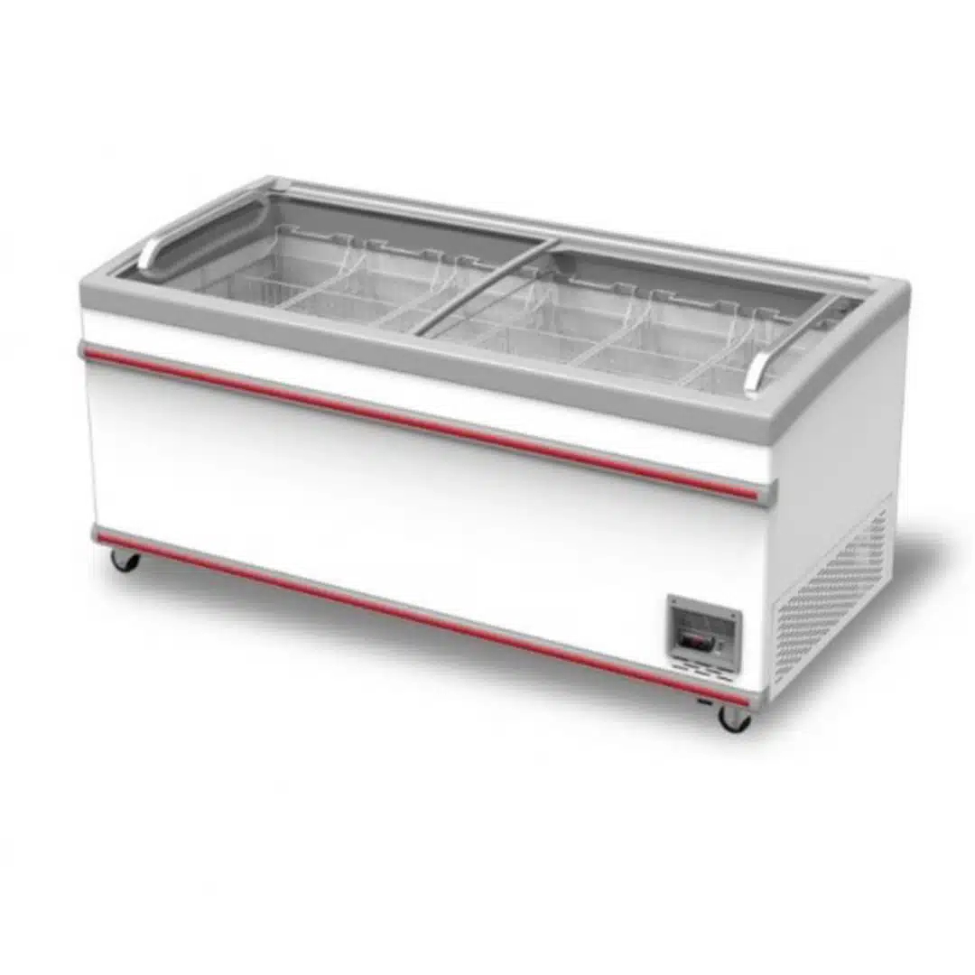 Congélateur coffre vitré, couvercle coulissant, vitre droite