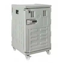 Conteneur isotherme 300 litres sur roulettes, pour le transport de produits frais à température contrôlée.