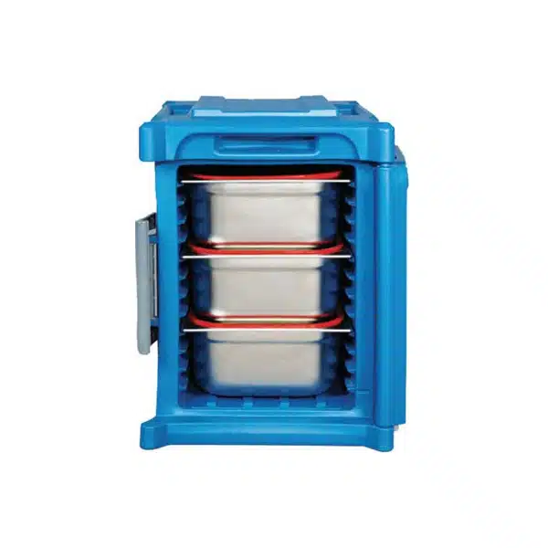 Conteneur isotherme à chargement frontal, pour la conservation d’aliments chauds, frais.