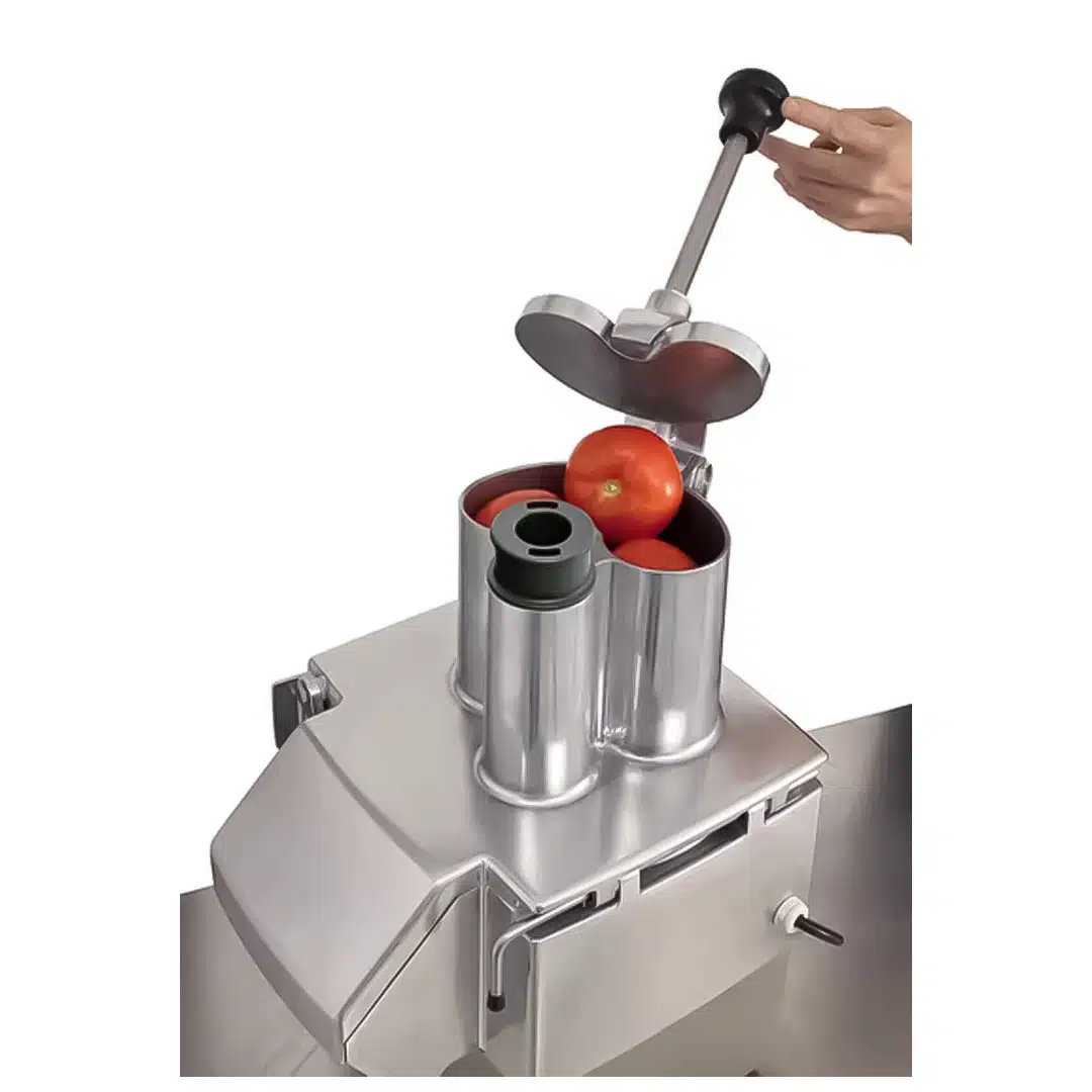 Équipé d’une grande goulotte de 139 cm², il facilite la coupe de légumes volumineux comme le chou ou le céleri. De plus, il peut traiter jusqu’à 10 tomates en une seule opération, optimisant ainsi votre flux de travail.