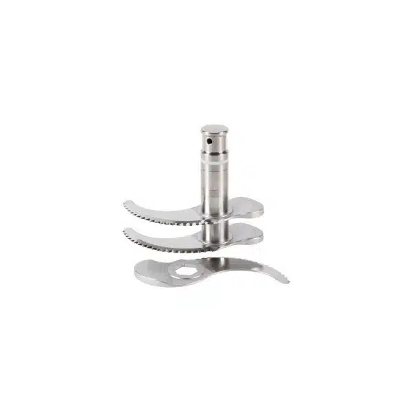 Couteau équipé de Trois lames crantées démontable permettant la réalisation de préparations pour la pâtisserie (broyages d’amandes, de noisettes, sucre glace…) produits congelés, poissons, coquillages, carcasses, chapelure, broyage de la glace et de tous les ingrédients durs.