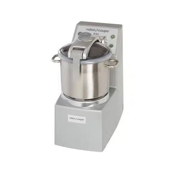 Cutter vertical R 20, idéal pour travailler de grands volumes en un minimum de temps : hacher la viande, réaliser les sauces, mayonnaises, le broyage d’amandes, le pétrissage…