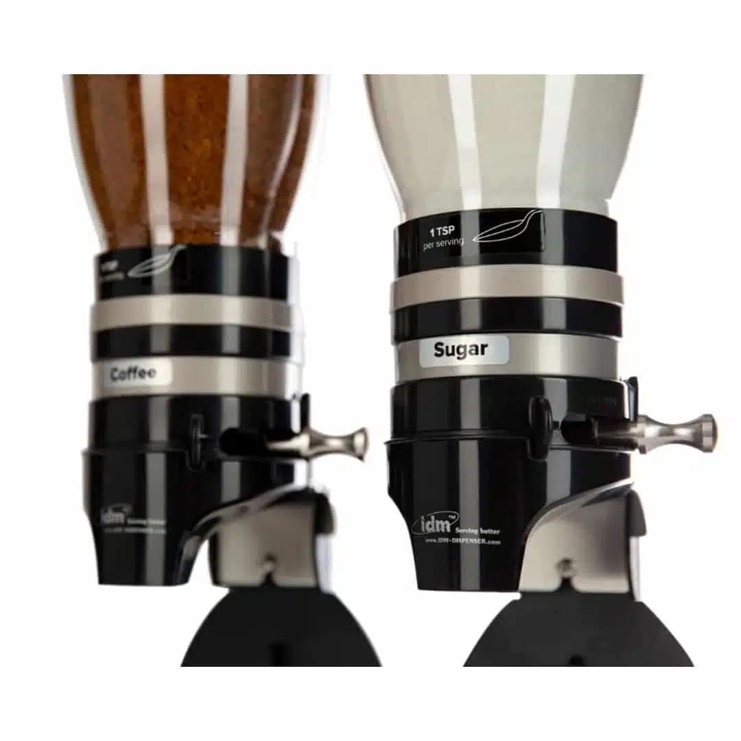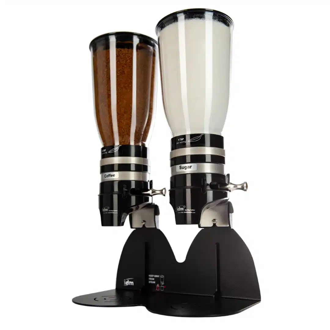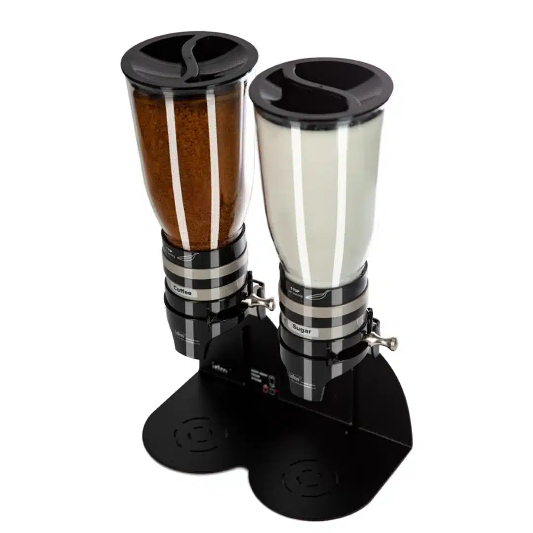 Distributeur de café soluble et sucres, double, adapté à des produits en poudre tel que le sucre, le cacao, le café, avec système ‘‘ Click  » permettant d’éviter le gaspillage ainsi que les fuites.