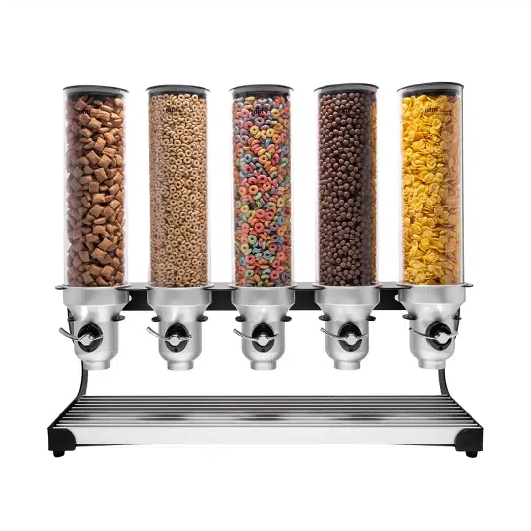 Distributeur de céréales « Free Flow » 5 x 4.5 L, convient pour les céréales, granola, légumineuses, noix, céréales, haricots, graines, grains de café, herbes, bonbons, pépites de chocolat, aliments pour animaux, matériaux industriels.