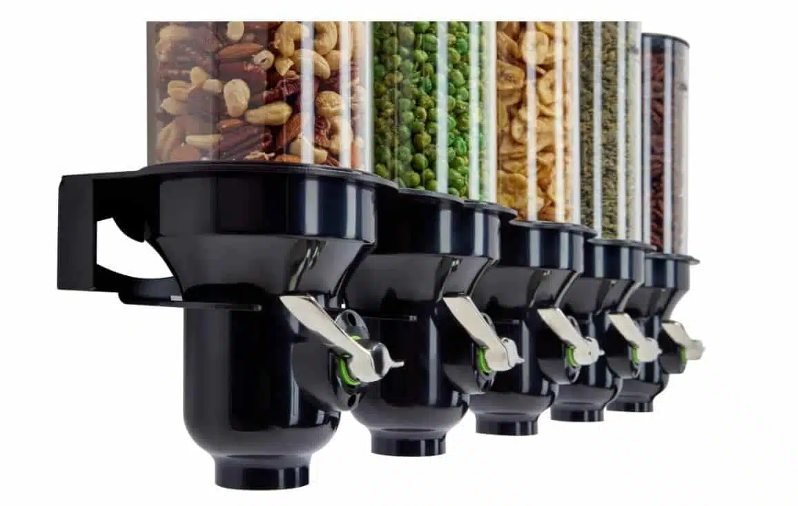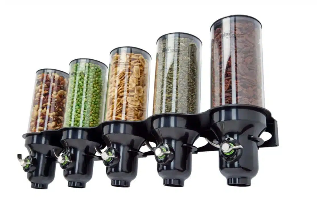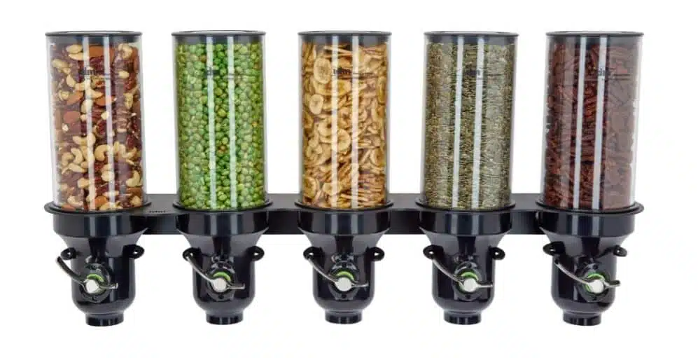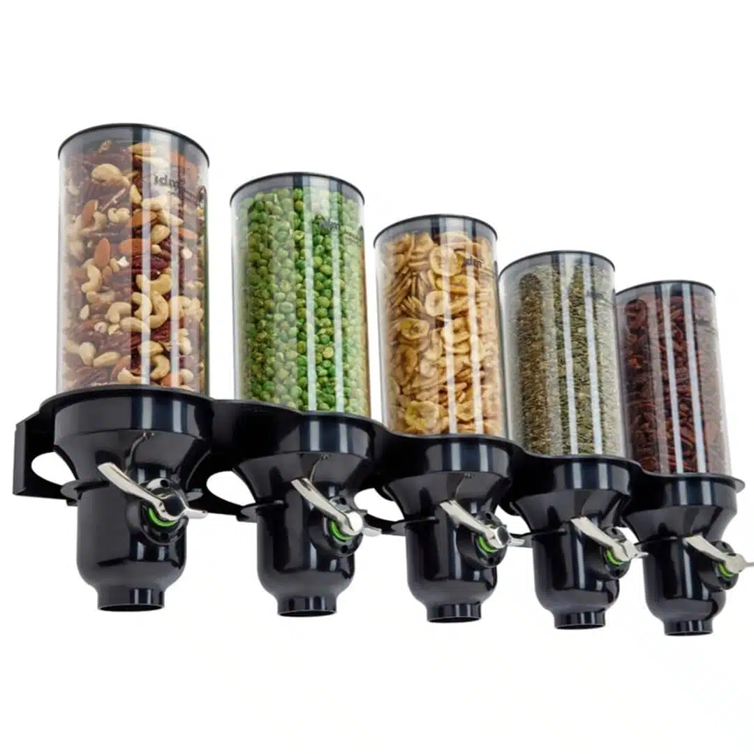 Distributeur d’aliments secs gamme Free Flow, 5 conteneurs SAN, idéal pour toutes sortes de céréale, granola, légumineuses, noix, pois, riz, etc…