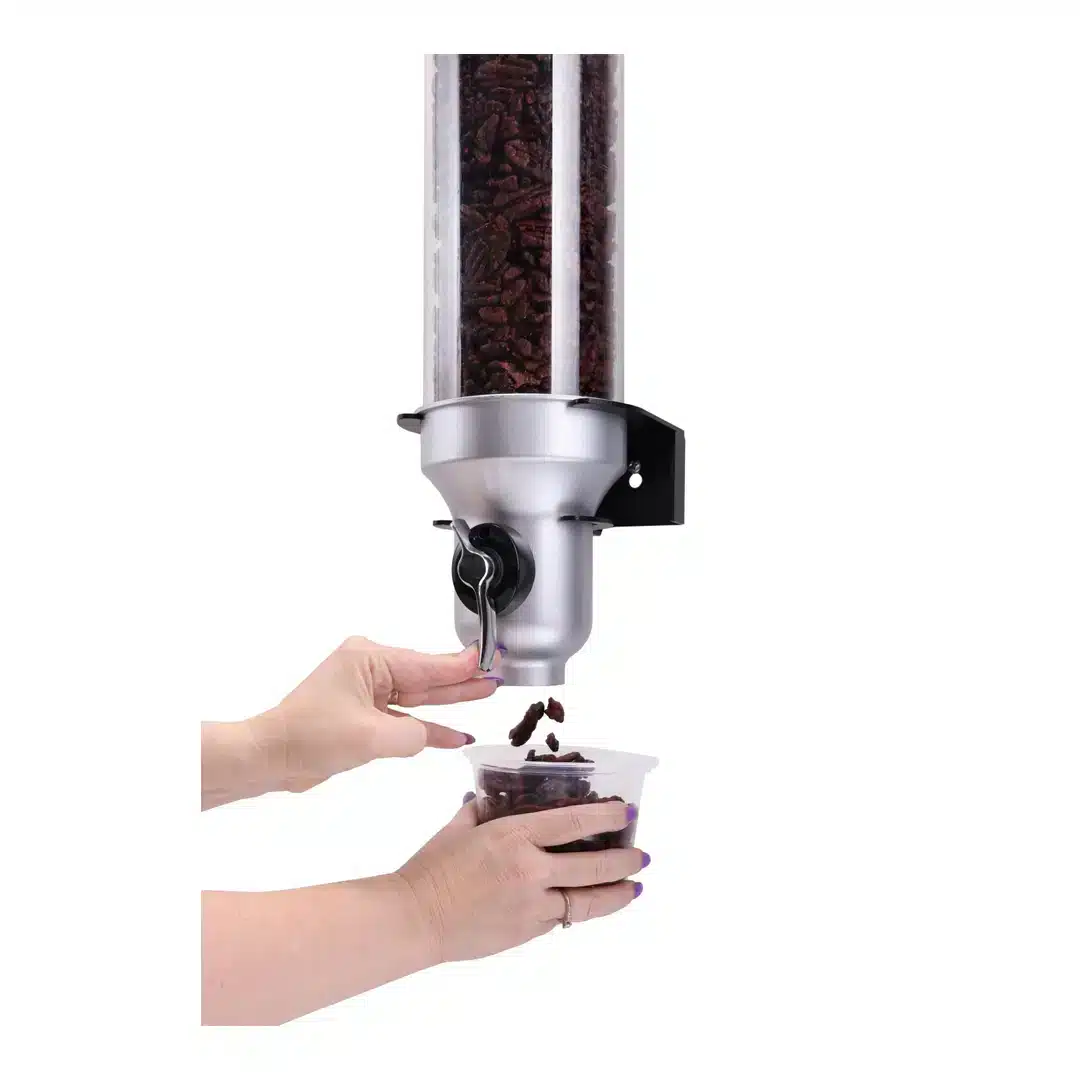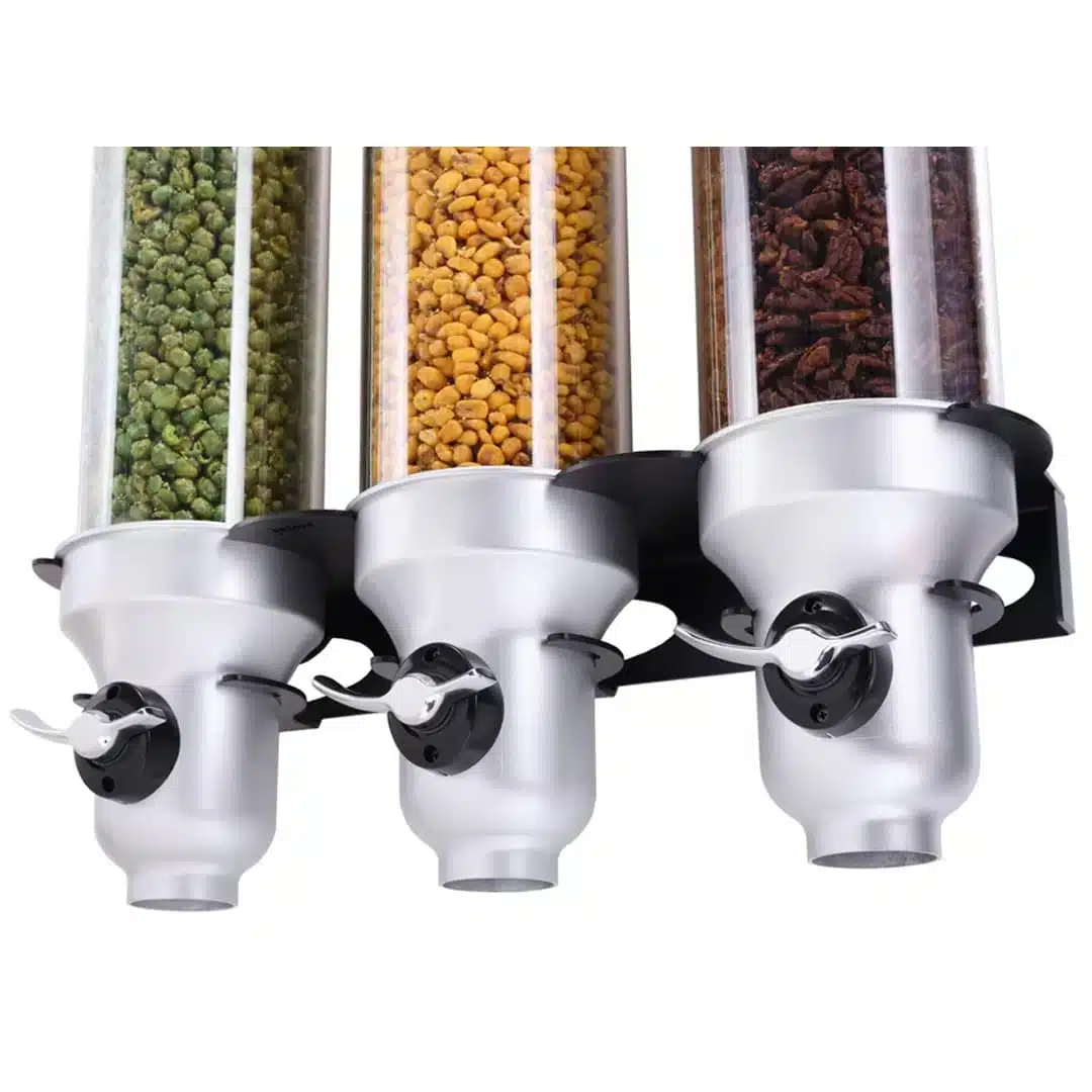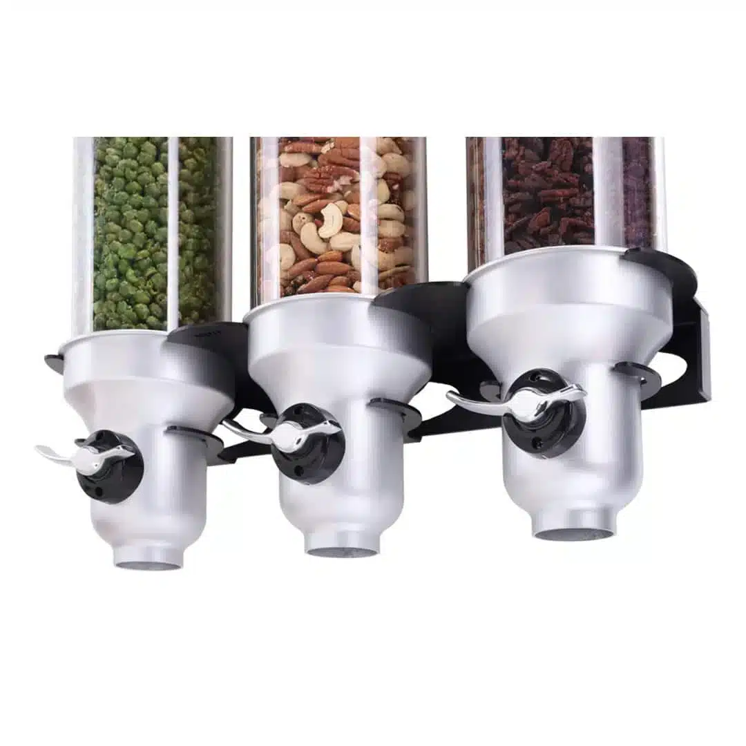 Distributeur mural d’aliments biologiques et secs « Free Flow » 3 x 4.5 L, convient pour les céréales, granola, légumineuses, noix, céréales, haricots, graines, grains de café, herbes, bonbons, pépites de chocolat, aliments pour animaux, matériaux industriels.