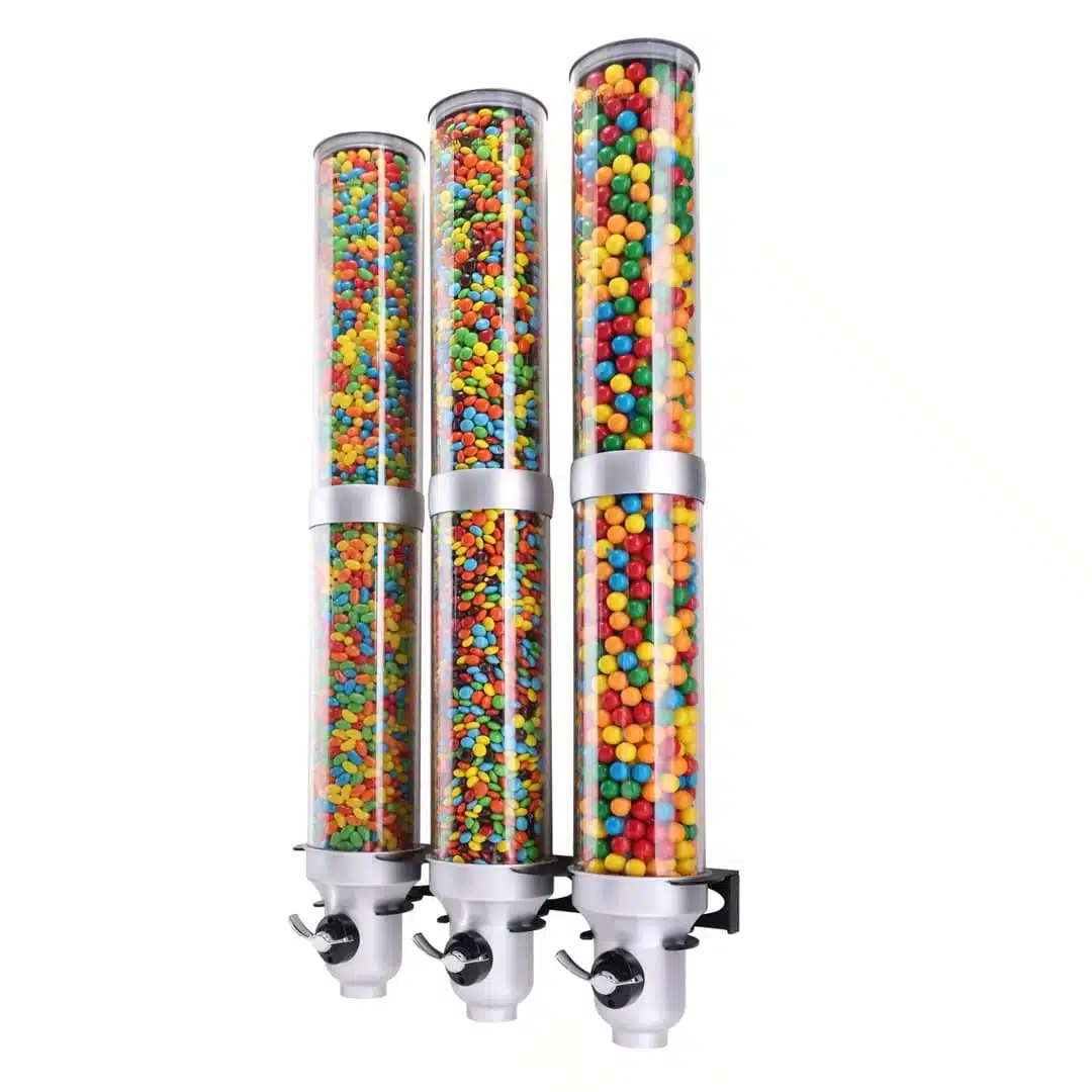 Distributeur mural de bonbons « Free Flow » 3 x 9 L, convient pour les Jelly Beans, M&M’s, pépites de chocolat, chewing-gum et bien d’autres encore.