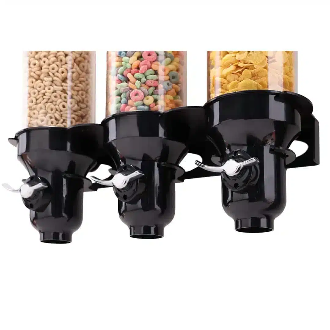 Distributeur mural de céréales « Free Flow » noir 3 x 4.5 L, convient pour les céréales, granola, légumineuses, noix, céréales, haricots, graines, grains de café, herbes, bonbons, pépites de chocolat, aliments pour animaux, matériaux industriels.