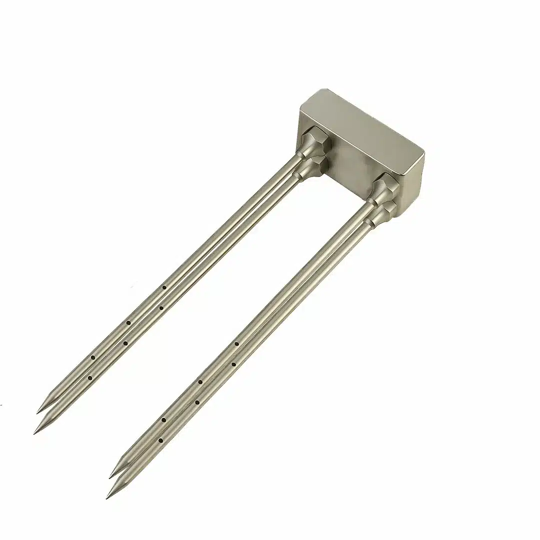Ensemble de 4 aiguilles carrées de 150 x Ø 4 mm. Conçues en acier inoxydable, ces aiguilles assurent une injection précise et uniforme de saumure.