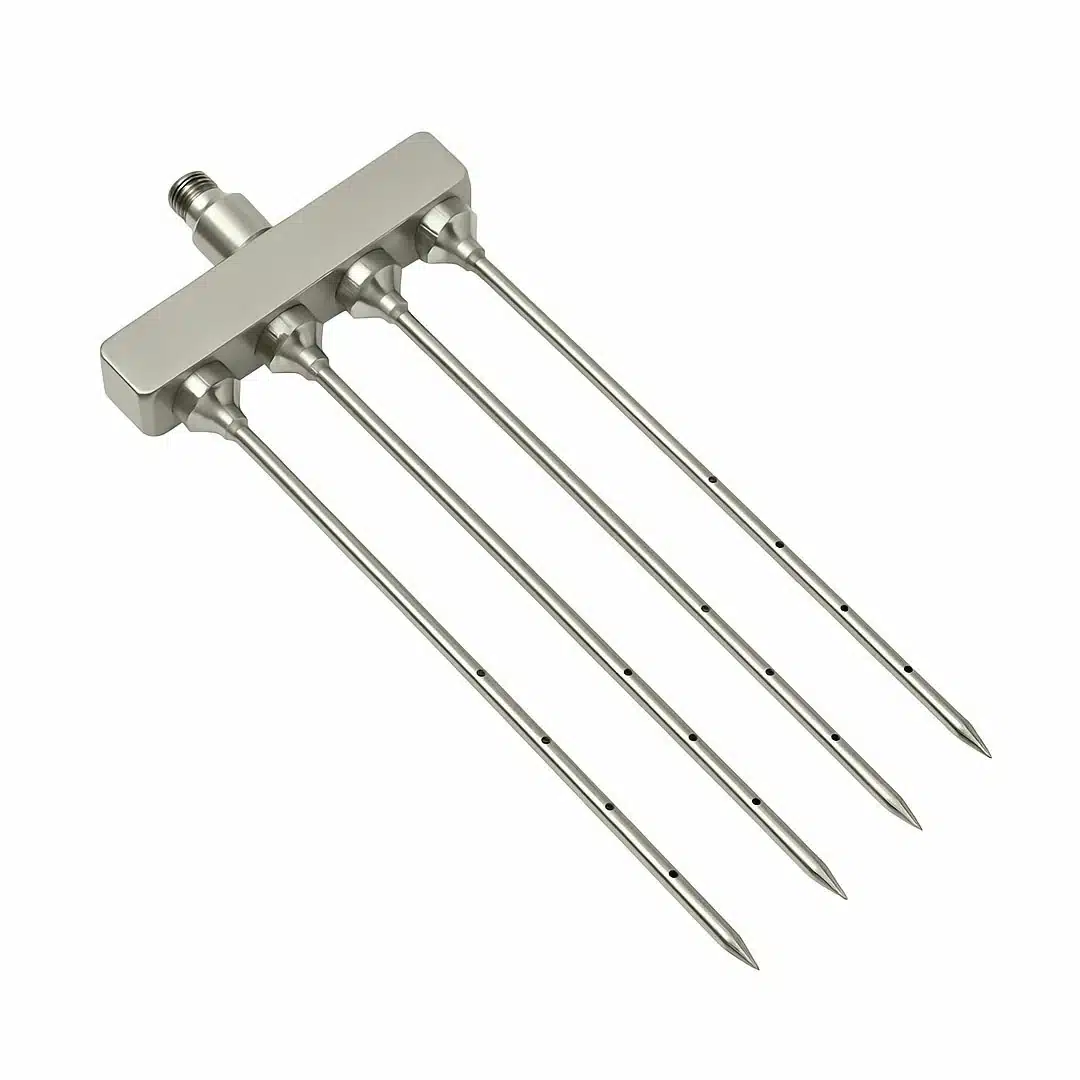 Ensemble de 4 aiguilles en ligne de 150 x Ø 4 mm. Fabriquées en acier inoxydable, ces aiguilles assurent une injection précise et uniforme de saumure.