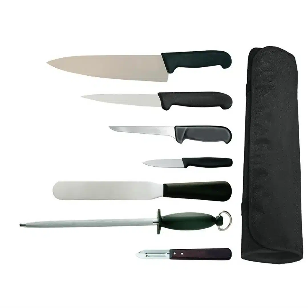 Ensemble de couteaux 7 pièces et étui, indispensable pour les professionnels de la restauration.