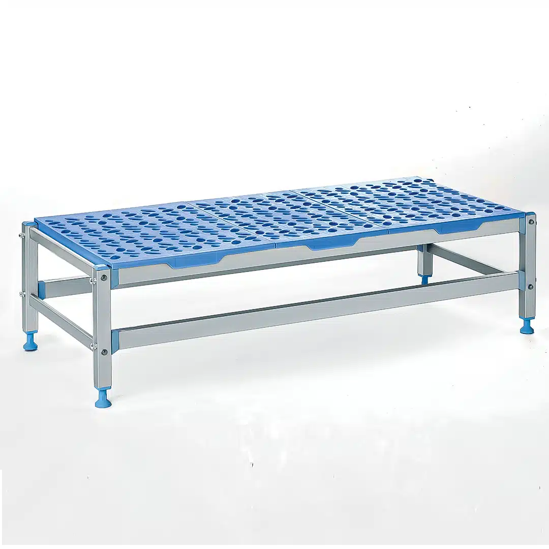Ensemble constitué de 2 échelles basses + 1 étagère à clayette en polypropylène.