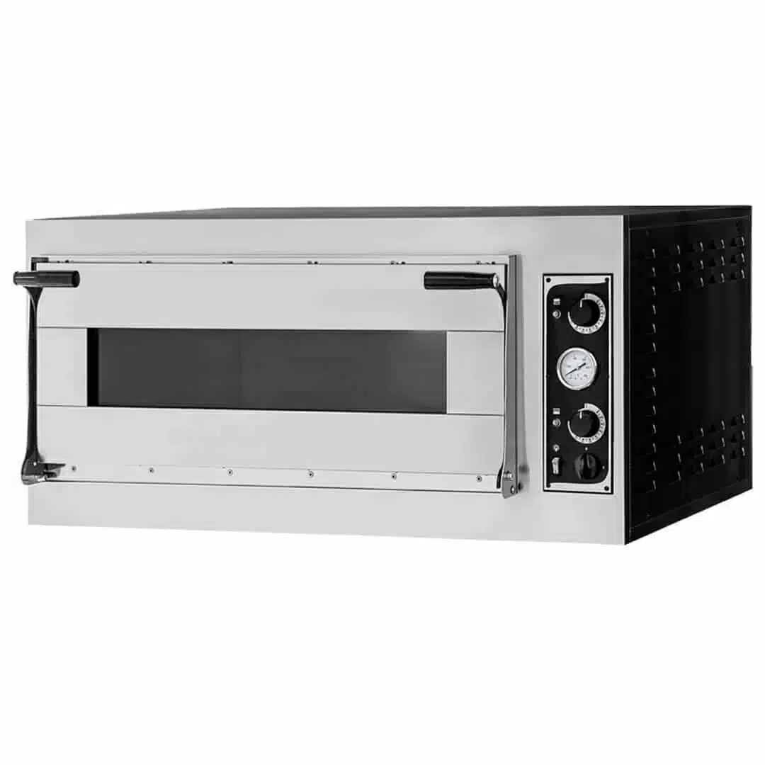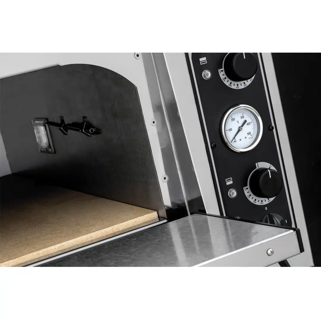 Conçu pour cuire jusqu’à 6 pizzas de 35 cm, ce four permet également l’insertion de 3 plaques de 40 x 60 cm en une seule fournée.