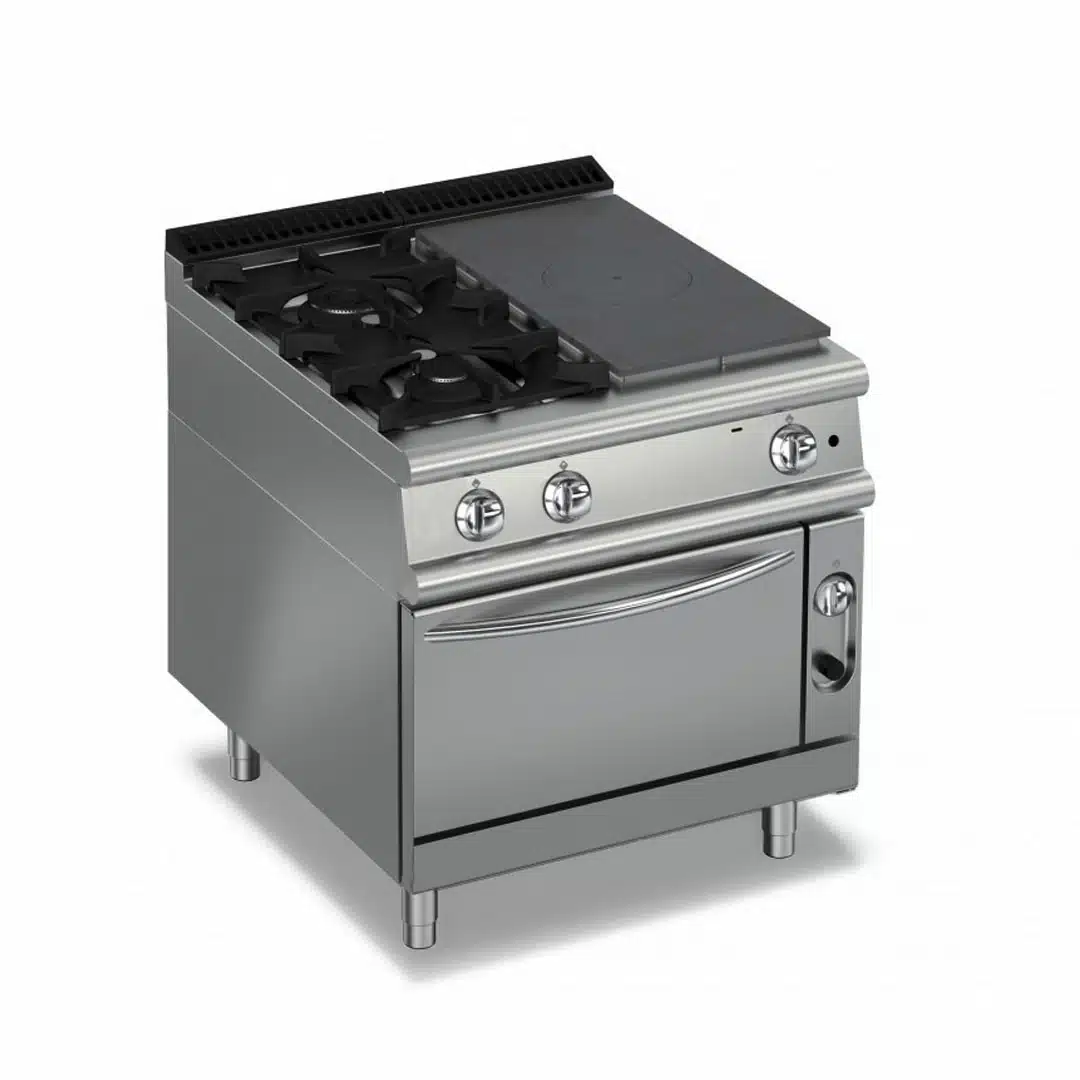 Fourneau professionnel 2 feux vifs gaz avec 1/2 plaque coup de feu et four électrique – Gamme 700