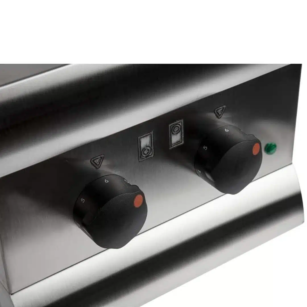 Chaque plaque dispose de commandes indépendantes à 6 positions, permettant d’ajuster précisément la température en fonction de vos besoins. Cette précision assure une cuisson parfaite, adaptée à chaque type d’aliment.