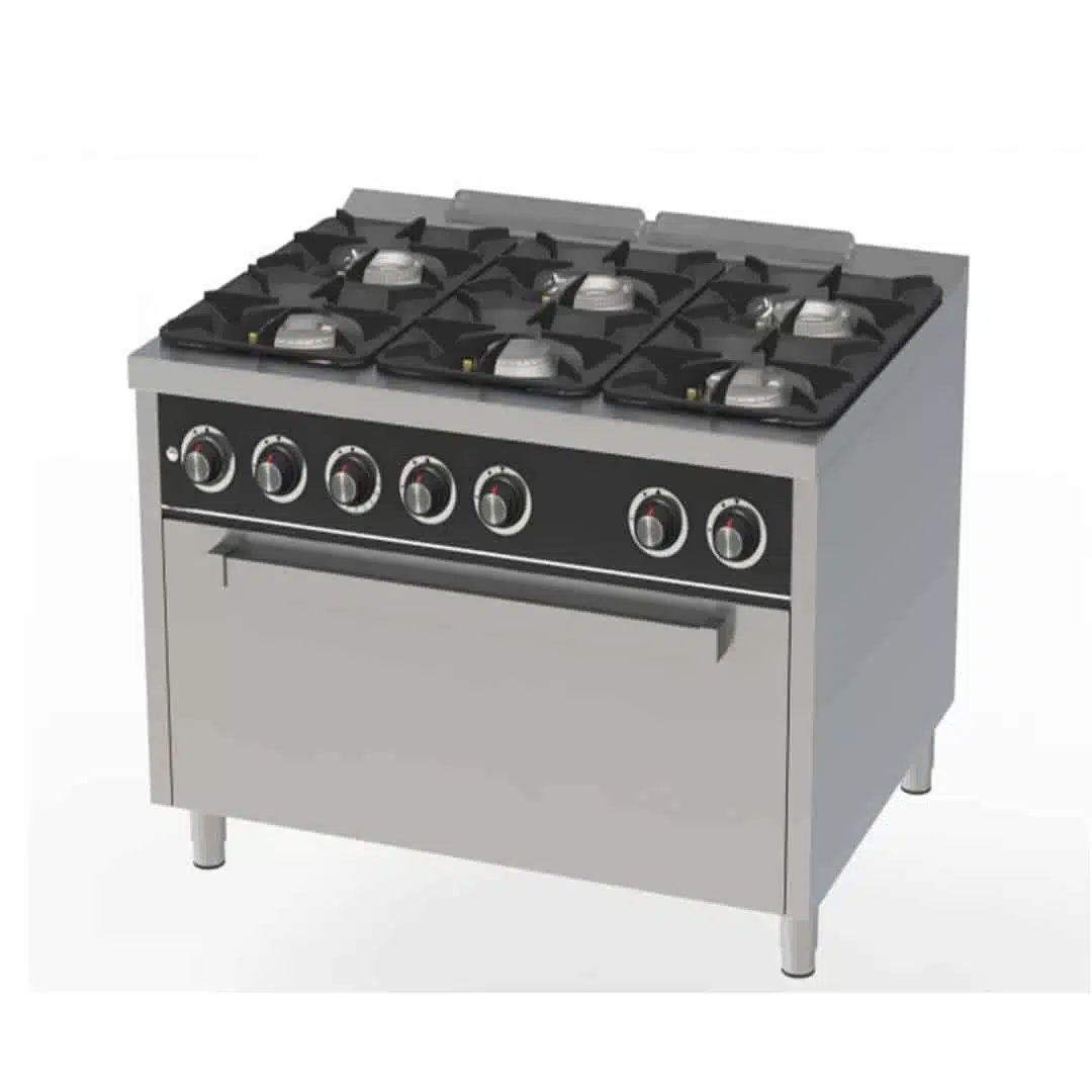 Fourneau à gaz avec four à gaz maxi, 6 feux, permet de réaliser plusieurs préparations simultanément, idéal pour les professionnels de la restauration.