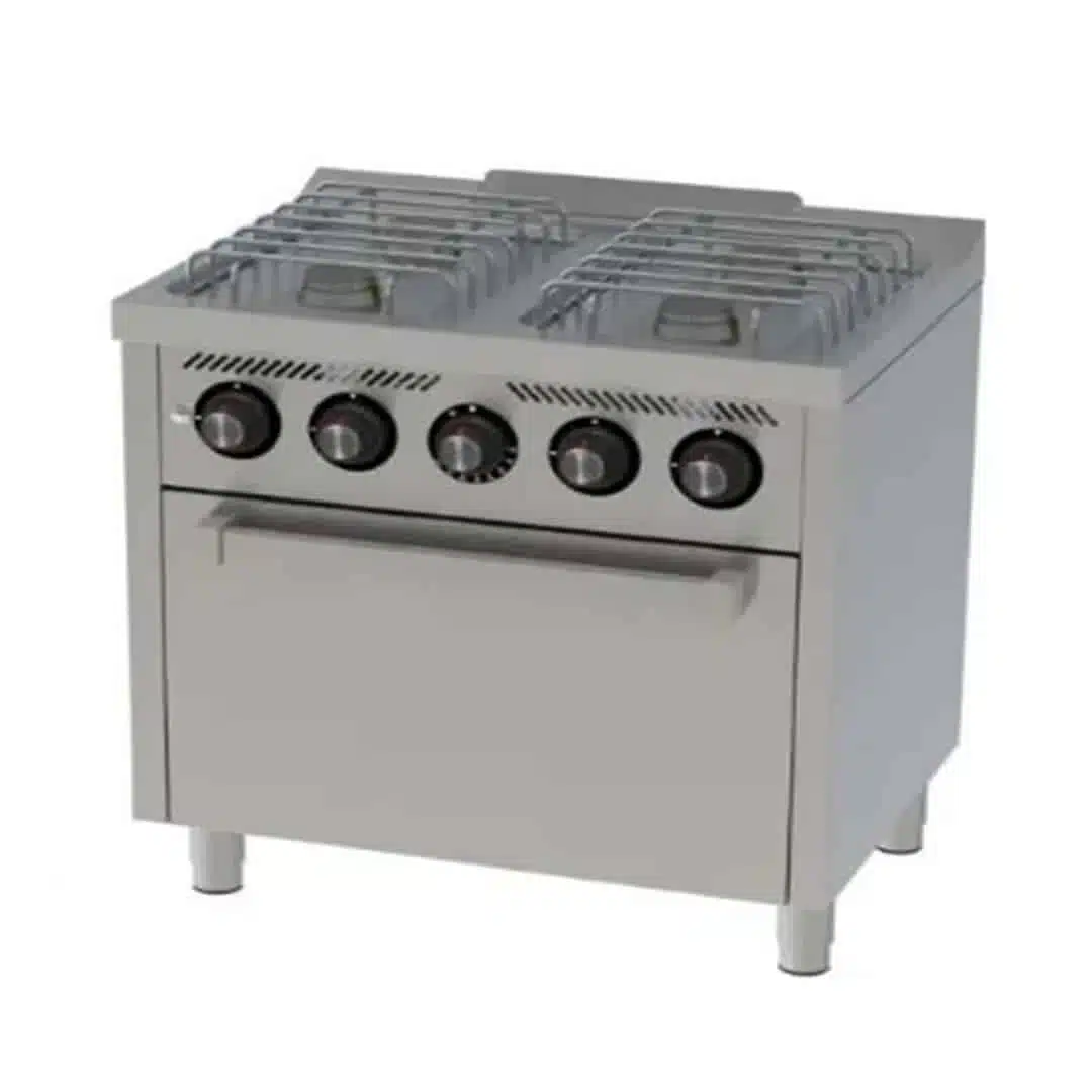Fourneau à gaz avec four à gaz GN 1/1, 4 feux, permet de réaliser plusieurs préparations simultanément, idéal pour les professionnels de la restauration.